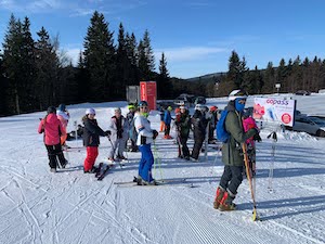 Šli jsme s lyžemi ke vleku, což bylo vysilující. Lyžovali jsme chvíli volně a pak bylo rozřazování.